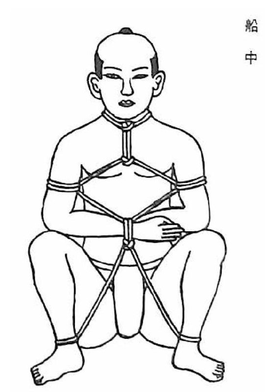 Сделайте петлю и оберните веревку вокруг плеч заключенного, убедившись, что веревки расположены в поперечном направлении к позвоночнику. Оберните веревку три раза вокруг тела, следя за тем, чтобы руки были заблокированы. Затем пропустите веревку дважды под линиями. Затяните узел, пропустите веревку вниз, чтобы связать запястья